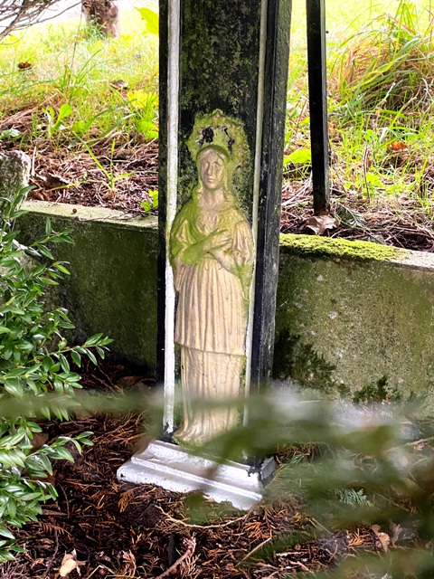 kleinen Nische des Säulen-Bildstocks steht eine "Medjugorje-Madonna",