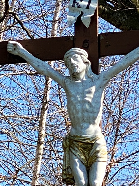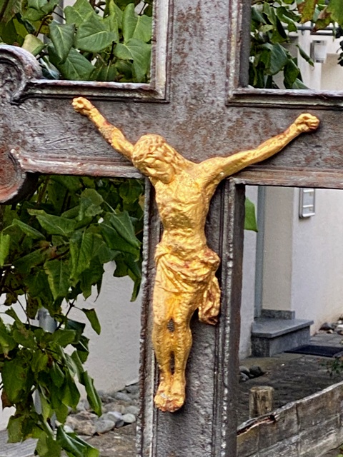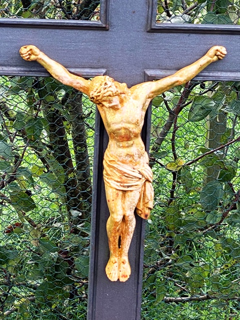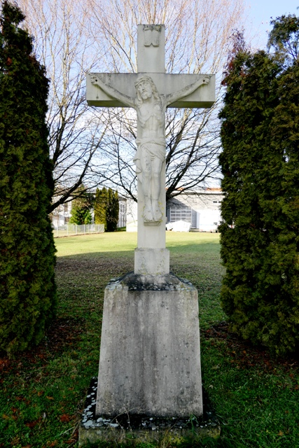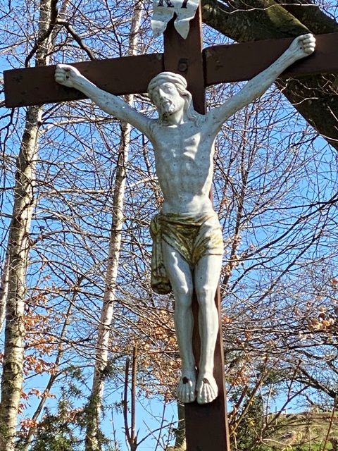 - Das Steinkreuz mit einem überdimensional großen Christuskorpus
